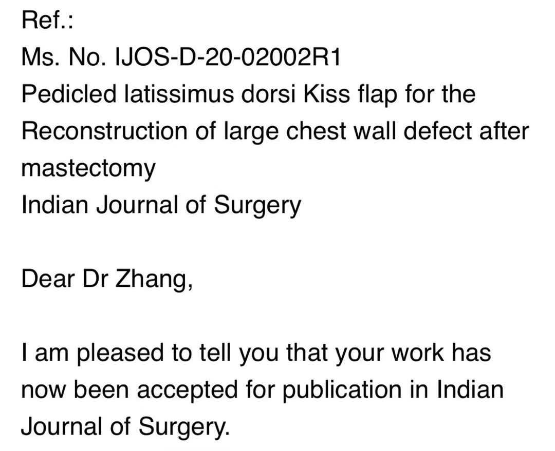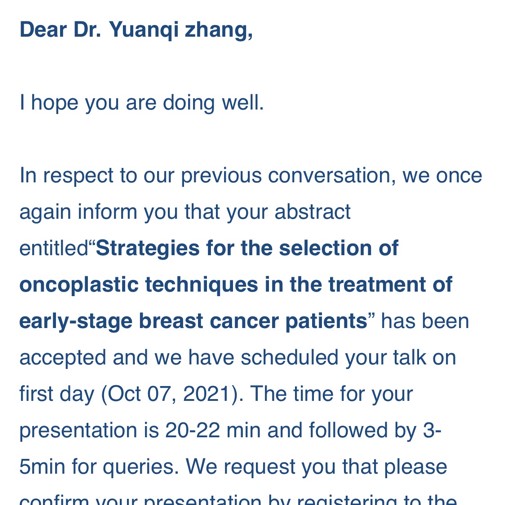 大会采取线上直播和线下学术报告交流相结合的方式,今年年中,张远起副院长在breast cancer webinar编辑部投递题为“Strategies for the selection of oncoplastic techniques in the treatment of early-stage breast cancer patients”(在早期乳腺癌患者中肿瘤整形技术的选择策略)的摘要,被编辑部选中并邀请参加本次会议作主题演讲,也是与会者中唯一一名被邀请介绍乳腺肿瘤整形手术经验的亚洲代表。张远起副院长通过医院远程会诊中心在大会上作了发言,介绍了乳腺肿瘤整形修复(oncoplastic breast surgery),这是一种结合整形外科的美学观念和肿瘤外科的根治观念手术,重新定义了保乳手术,能在不影响肿瘤安全性的前提下,从乳腺中切除癌变组织并以整形外科的方法对畸形的乳房进行修复,帮助患者重塑乳房外形,改善术后乳房美容效果,但许多乳腺医师对该项技术感到陌生,难以在临床上实施。张远起副院长在此次大会上,就乳腺肿瘤整形修复术如何做好微痕化切口设计、如何做好不同象限的容量移位及容量替代方法进行了介绍,帮助更多乳腺医师熟悉并掌握该项技术。同时,他对近年来在ac米兰官网中文网站乳腺外科行乳腺肿瘤整形修复治疗的220 例乳腺癌患者进行了总结,并开展了对照研究。最后张远起副院长总结道乳腺肿瘤整形手术目前是临床I、II期乳腺癌患者常用手术方式,在保证肿瘤安全性的同时,避免了乳房全切,乳房术后美容效果的最优化,是治疗早期乳腺癌的较好外科手段之一。张远起副院长的报告内容得到各位参会专家的一致认可和好评。