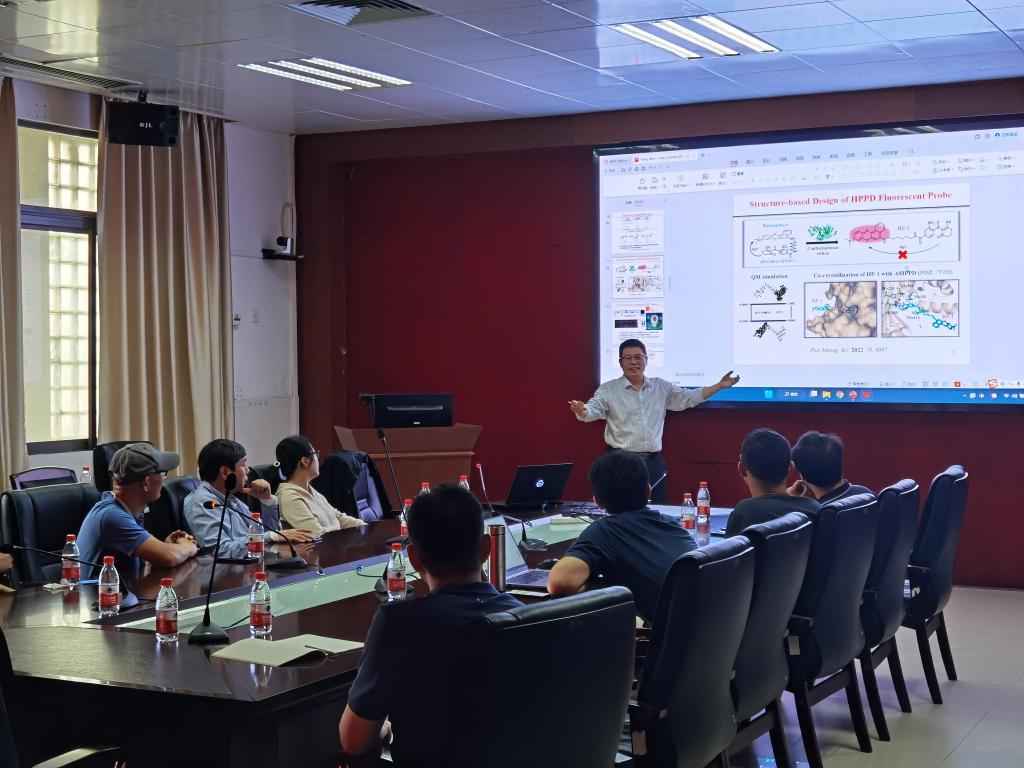 杨文超教授围绕“酶与配体相互作用”主题进行交流与分享。他的团队从分子水平对对羟苯基丙酮酸双加氧酶(HPPD)开展了系统的化学生物学研究,阐明了酶的初步催化机制及其与商品化抑制剂之间的作用机制。此外,从靶标酶的三维结构出发,其团队发展了基于分子间弱相互作用调控的小分子荧光探针设计策略,并应用到一系列重要的生物酶体系。报告会上,参会的师生就蛋白质的三维结构解析策略、靶标酶的小分子抑制剂研发等问题与杨文超教授进行了互动交流。