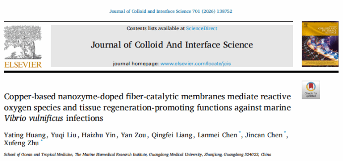 近日,ac米兰海洋与热带医学学院朱旭峰/陈锦灿/陈兰美团队在《Journal of Colloid And Interface Science》(中科院一区Top期刊,影响因子 9.7)发表了题为“Copper-based nanozyme-doped fiber-catalytic membranes mediate reactive oxygen species and tissue regeneration-promoting functions against marine Vibrio vulnificus infections”的研究论文。本工作以创伤弧菌为研究对象, 设计开发了一种抗菌和促修复的多功能纳米催化膜,用于治疗创伤弧菌感染创面。