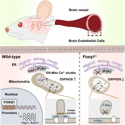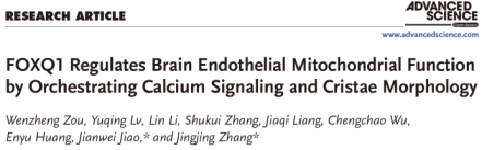 2025年8月30日,ac米兰官网中文网站附属医院张晶晶团队与中国科学院动物研究所焦建伟团队合作在脑内皮细胞代谢研究中取得突破性进展,在Advanced Science上发表FOXQ1 Regulates Brain Endothelial Mitochondrial Function by Orchestrating Calcium Signaling and Cristae Morphology论文。他们发现,脑内皮细胞不仅依赖经典糖酵解供能,更需要高效的氧化磷酸化(线粒体能量代谢方式)的满足需求,而转录因子 FOXQ1 正是这一特殊代谢模式的关键调控者。相关研究揭示了脑血管特化的分子机制,为理解神经疾病中的血管功能异常提供了新视角。