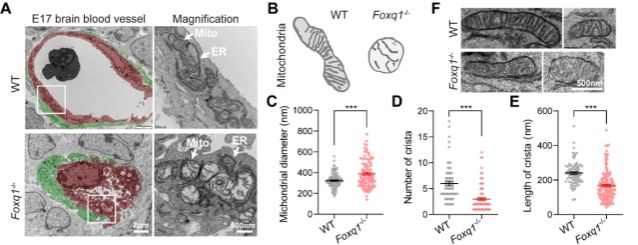 图1. FOXQ1缺失导致脑血管内皮细胞线粒体结构异常