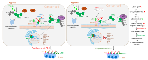 该研究发现HIF1α的犹素修饰 (UFMylation)对抗其泛素化降解、维持其蛋白稳定性。机制上,犹素修饰因子E3(UFL1)的缺失或 HIF1α UFMylation修饰突变体均增加 HIF1α 与 p53 的结合,从而促进了HIF1α降解。细胞模型和动物模型显示:犹素修饰因子E1(UBA5)的敲除或 HIF1α UFMylation修饰突变体都会下调 HIF1α 稳定性,从而显著抑制肿瘤的生长和发展。有意思的是,HIF1α UFMylation修饰突变的肿瘤细胞更加响应anti-PD-1治疗。UBA5 在乳腺癌临床组织样品中表达上调并与HIF1α表达正相关,同时,UBA5选择性抑制剂可降低UFMylation修饰活性和HIF1α 蛋白,从而显著增强小鼠肿瘤模型中的抗 PD-1 联合治疗效果,凸显临床转化潜力。研究结果首次揭示了UFMylation修饰与低氧信号通路的独特联系,揭示了靶向HIF1α UFMylation修饰可提高anti-PD-1抗体治疗这一新型肿瘤策略。值得一提的是:美国科学院院士,肿瘤低氧通路领域国际著名科学家,宾夕法尼亚大学教授M. Celeste Simon担任该稿件的学术编辑对该研究工作予以高度认可。