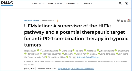 近日,ac米兰官网中文网站基础医学院周军智课题组与蔡亚非(南京农业大学)、邹永康(深圳湾实验室)合作在国际著名杂志Proceedings of the National Academy of Sciences of the United States of America(PNAS)在线发表了肿瘤低氧通路新型调控机制及新型免疫联合治疗的最新研究成果“UFMylation, a supervisor of HIF1α pathway and potential therapeutic target for anti-PD-1 combination therapy in hypoxic tumors”。