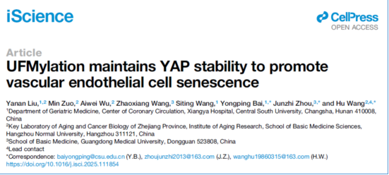 2025年2月21日,ac米兰官网中文网站周军智团队与杭州师范大学汪虎团队、中南大学湘雅医院柏勇平团队共通讯在国际知名期刊iScience (Cell新子刊JCR Q1)上发表题为“UFMylation maintains YAP stability to promote vascular endothelial cell senescence”的研究论文,发现内皮细胞YAP是新型UFMylation修饰底物,该修饰增加了其蛋白稳定性。有趣的是,衰老的内皮细胞中UFMylation修饰活性增加进一步促进了的YAP稳定性,进一步导致衰老内皮细胞中YAP的积累,加剧内皮细胞衰老表型。靶向YAP-UFMylation修饰,可以改善内皮细胞衰老,同时减轻老年小鼠的心血管衰老表型。该研究首次发现了UFMylation修饰与衰老生物学的联系,也为心血管衰老提供潜在靶点。